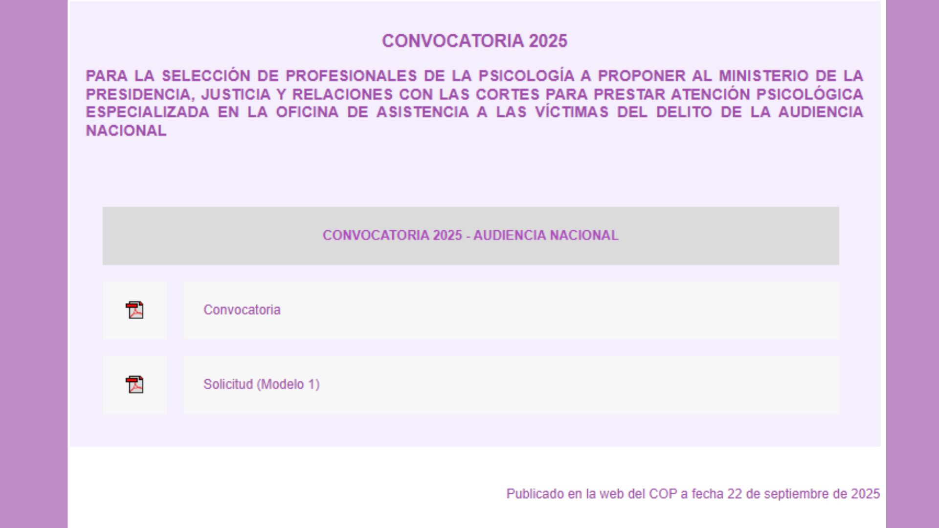 Convocatoria 2025 para la selección de profesionales de la psicología a proponer al Ministerio de la Presidencia, Justicia y Relaciones con las Cortes para prestar atención psicológica especializada en la Oficina de Asistencia a las Víctimas del Delito de la Audiencia Nacional