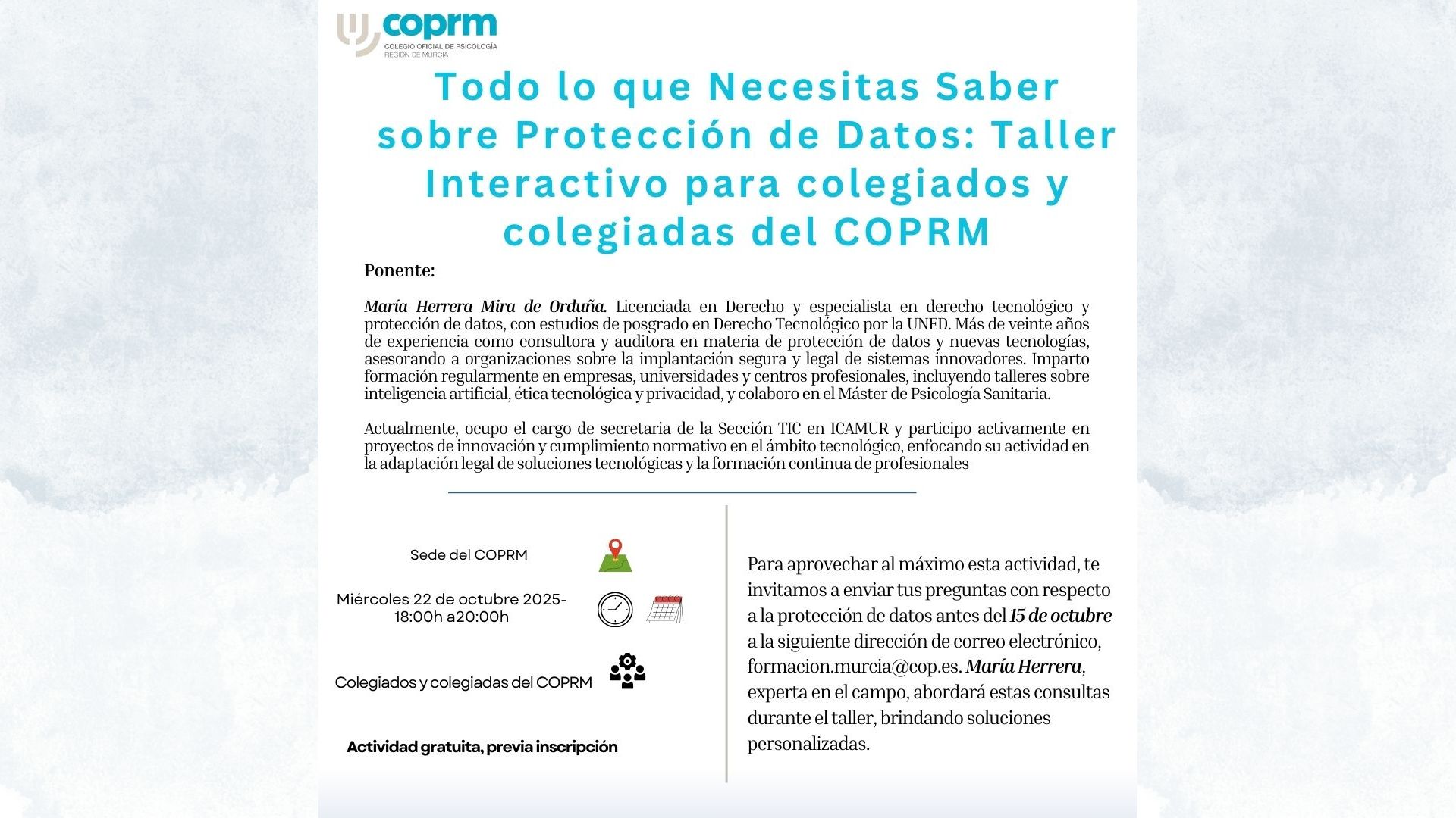 Miércoles 22 de octubre de 2025, de 18:00 a 20:00h, presencial en el COPRM. Para aprovechar al máximo esta actividad, te invitamos a enviar tus preguntas con respecto a la protección de datos antes del 15 de octubre a la siguiente dirección de correo electrónico, formacion.murcia@cop.es. María Herrera, experta en el campo, abordará estas consultas durante el taller, brindando soluciones personalizadas.