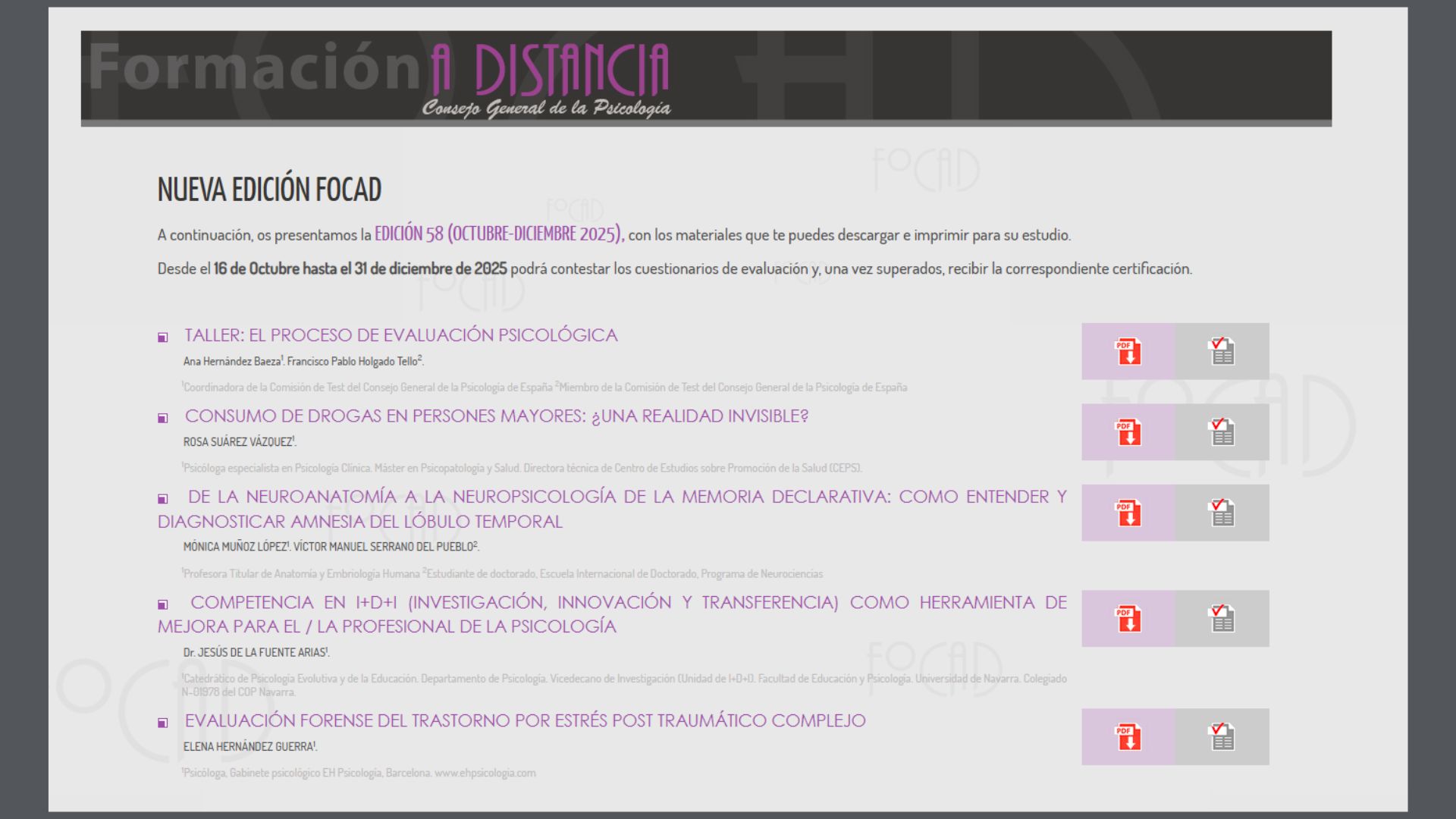 Os presentamos la Edición Nº 58 (Octubre - Diciembre 2025) con los materiales que te puedes descargar e imprimir para su estudio, a través de la página web oficial de FOCAD https://www.focad.es/, mediante clave personalizada (núm. de colegiado/a y NIF personal), tal y como se te indica en el espacio de ayuda