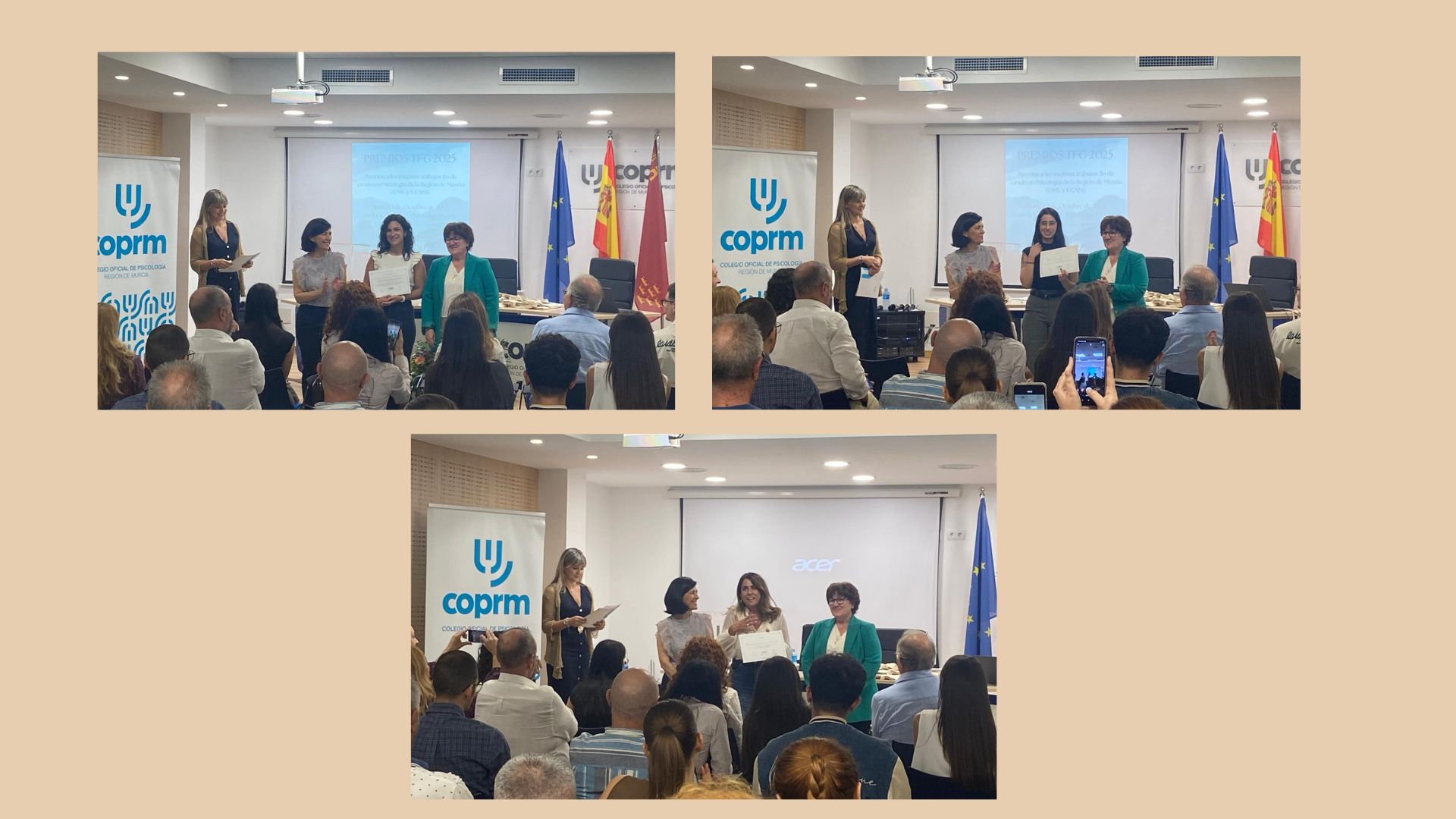 La decana del COPRM, Pilar Martín Chaparro y Secretaria Académica del Grado de Psicología de la UCAM, Olga Hernández Serrano, entregan los reconocimientos a los TFG’s de Susana Flores Riquelme, José Javier Piña Nicolás y Javier Rojas Villalba