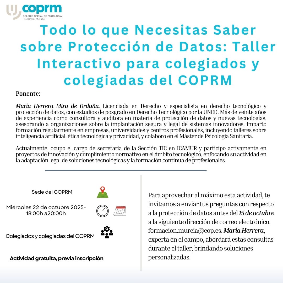 Para aprovechar al máximo esta actividad, te invitamos a enviar tus preguntas con respecto a la protección de datos antes del 15 de octubre a la siguiente dirección de correo electrónico, formacion.murcia@cop.es. María Herrera, experta en el campo, abordará estas consultas durante el taller, brindando soluciones personalizadas.