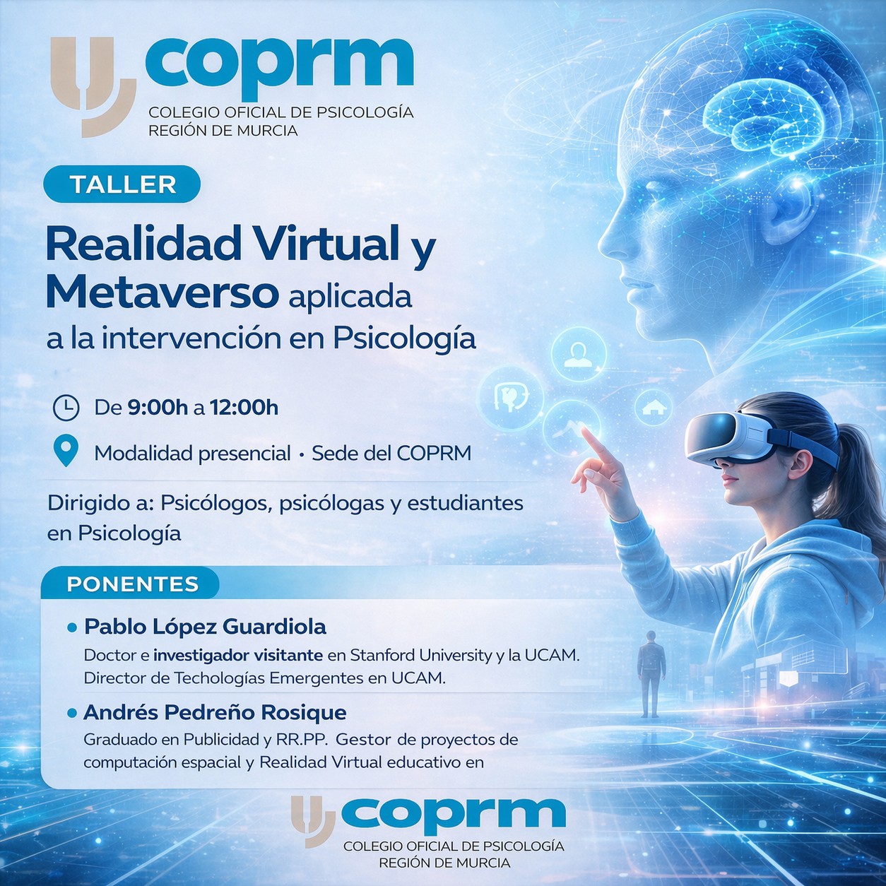 Ponentes: Pablo López Guardiola , doctor e investigador visitante en Stanford University y la UCAM, especializado en Innovación Educativa y Comunicación Humana. Investiga el impacto de la Inteligencia Artificial generativa y la computación espacial en la educación. Director de Tecnologías Emergentes en UCAM, impulsa la integración de tecnologías como IA, metaverso, robótica y aprendizaje inmersivo para transformar la enseñanza.