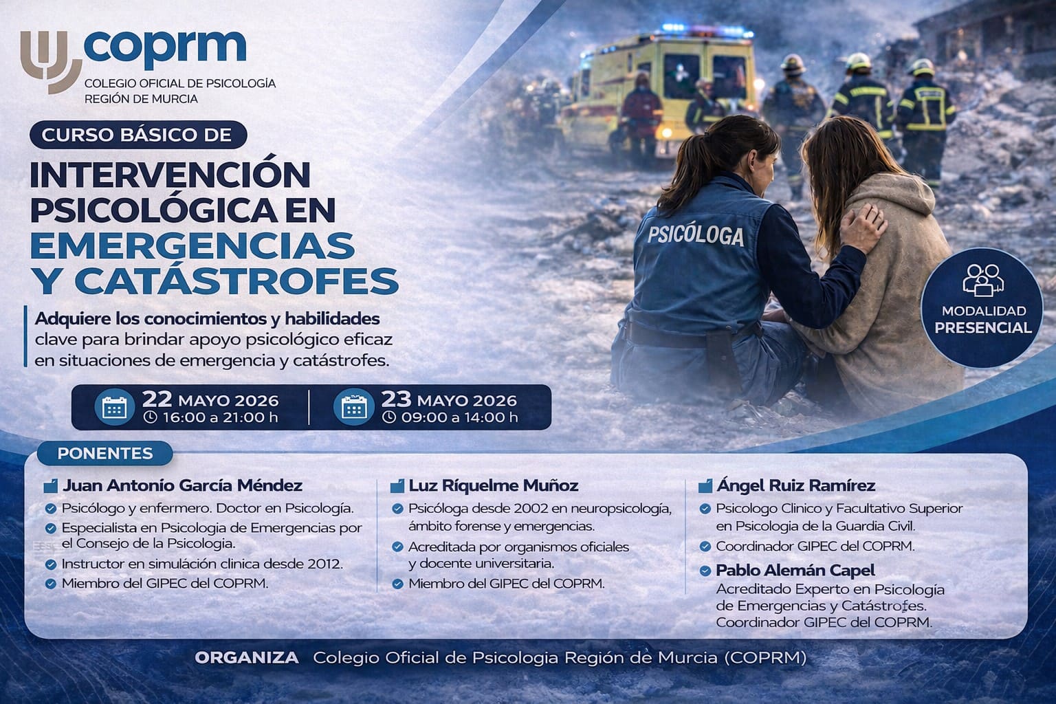Ponentes: Juan Antonio García Méndez. Psicólogo y enfermero. Doctor en psicología y especialista en psicología de emergencias por el consejo de la psicología. Instructor en simulación clínica desde 2012 y miembro del GIPEC del COPRM.