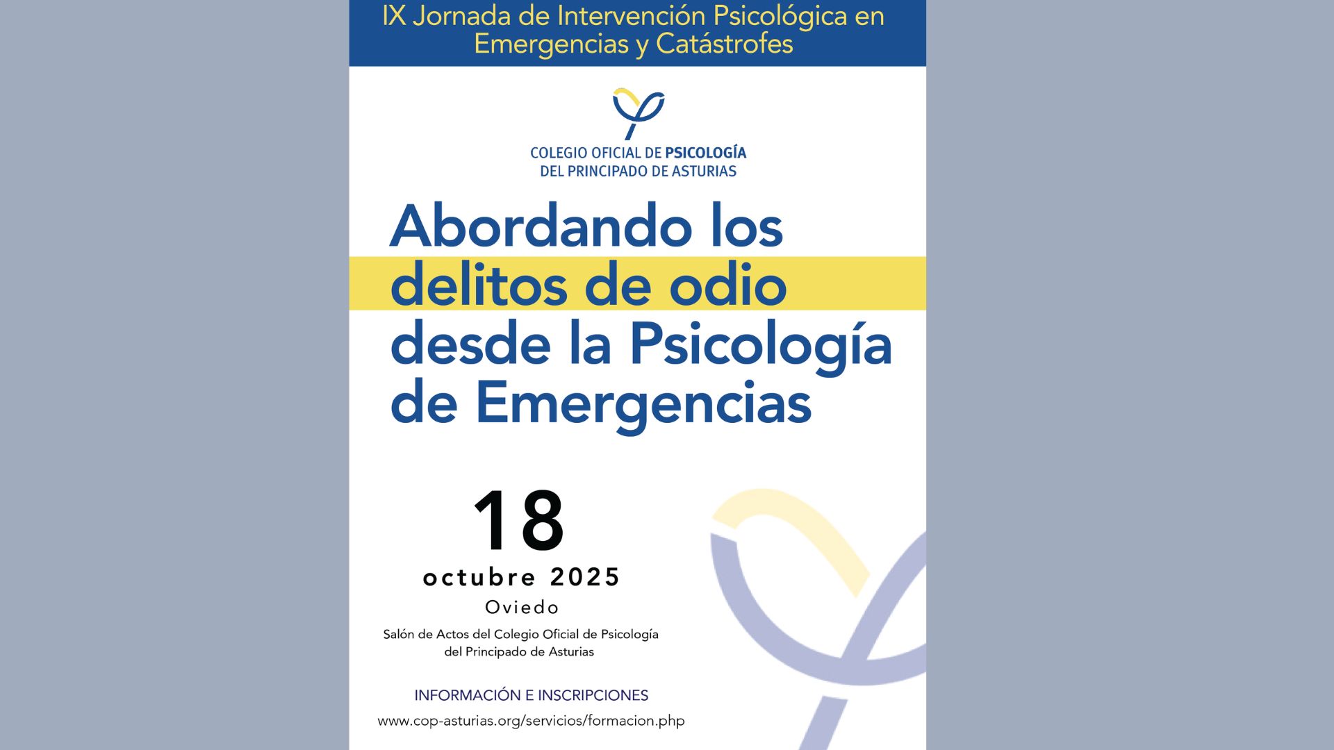 18 de Octubre, de 09:00 a 17:30h en Sede del COPPA y online. Organizado por la Comisión de Intervención Psicológica en Emergencias y Catástrofes del Colegio Oficial de Psicología del Principado de Asturias