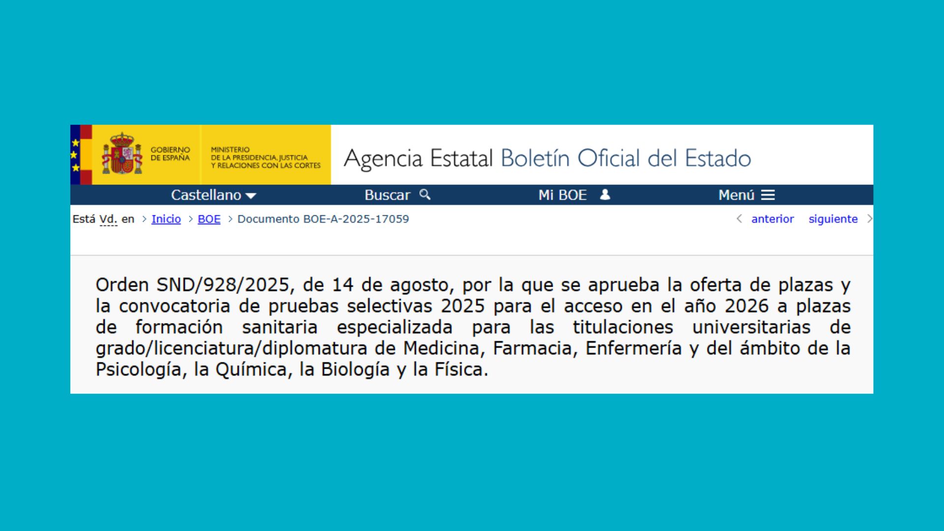 Orden SND/928/2025, de 14 de agosto, por la que se aprueba la oferta de plazas y la convocatoria de pruebas selectivas 2025 para el acceso en el año 2026 a plazas de formación sanitaria especializada para las titulaciones universitarias de grado/licenciatura/diplomatura de Medicina, Farmacia, Enfermería y del ámbito de la Psicología, la Química, la Biología y la Física, al que podéis acceder a través del siguiente enlace: