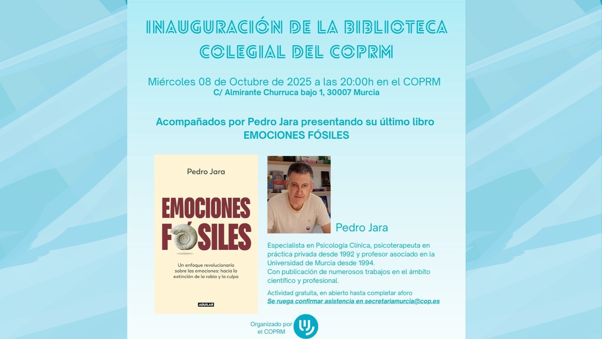 El acto será el próximo 8 de octubre en la sede de la institución con la presentación del libro “Emociones fósiles”, por parte de su autor, Pedro Jara a las 20:00h. Se ruega confirmar asistencia en secretariamurcia@cop.es