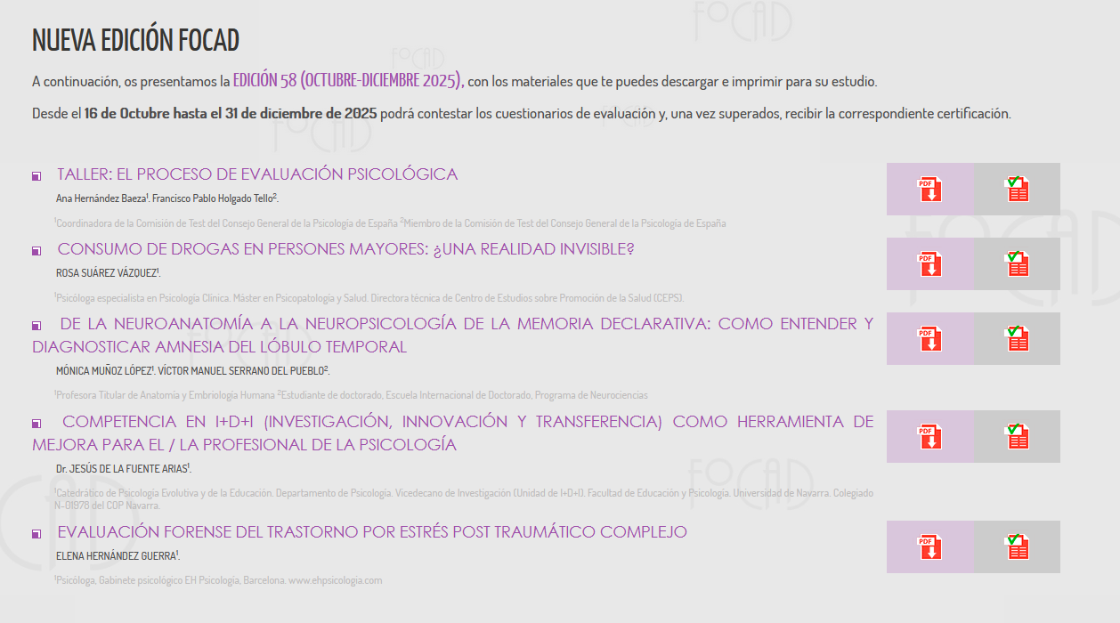 El Consejo General de la Psicología tiene en marcha un Programa de Formación Continuada a Distancia FOCAD en Psicología con la finalidad de promover la actualización científico-profesional de los/as psicólogos/as colegiados/as en diferentes campos de la intervención psicológica (Psicología Clínica y de la Salud, Psicología Educativa, Psicología del Trabajo, las Organizaciones y los Recursos Humanos, Psicología de la Intervención Social, Psicología de la Actividad Física y el Deporte, Psicología Jurídica, etc.).
