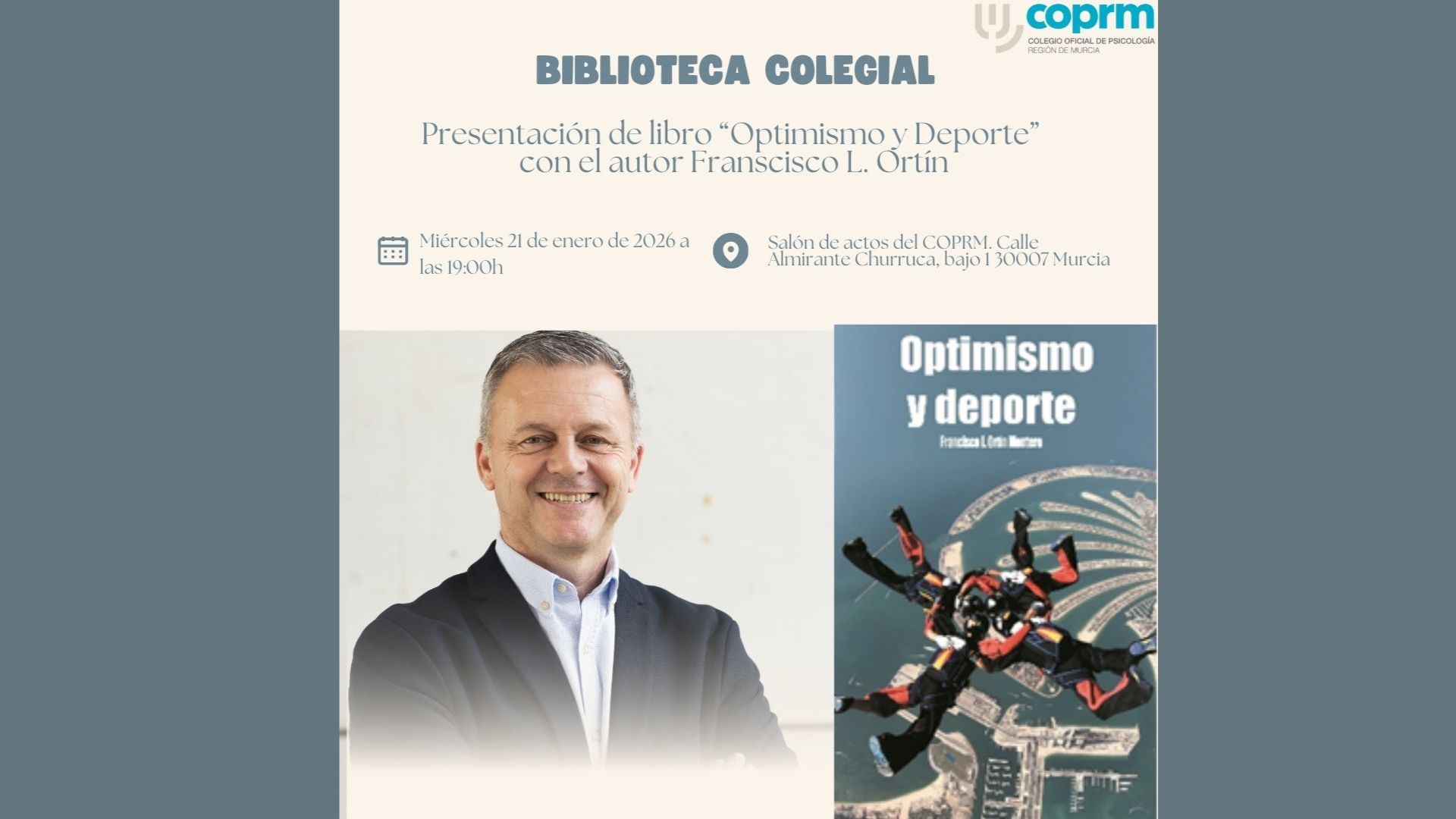 El próximo miércoles 21 de enero de 2026 a las 19:00 os esperamos en el salón de actos del COPRM (Calle Almirante Churruca, bajo 1 30007 Murcia) en la presentación del libro "Optimismo y Deporte" con el autor Francisco L. Ortín