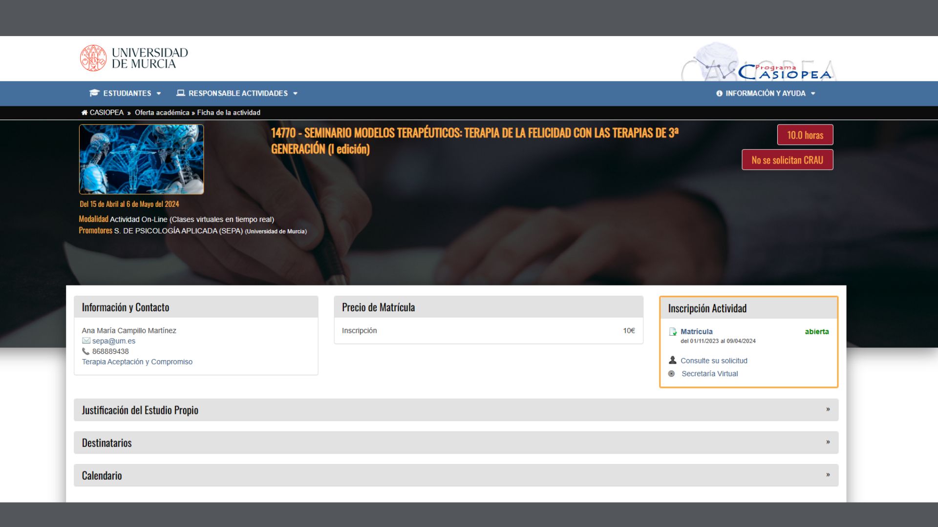El plazo de matrícula está abierto hasta el 9 de abril. Plazas limitadas. Pueden matricularse y ver más información en el enlace https://casiopea.um.es/cursospe/modelosterapeuticosi.f