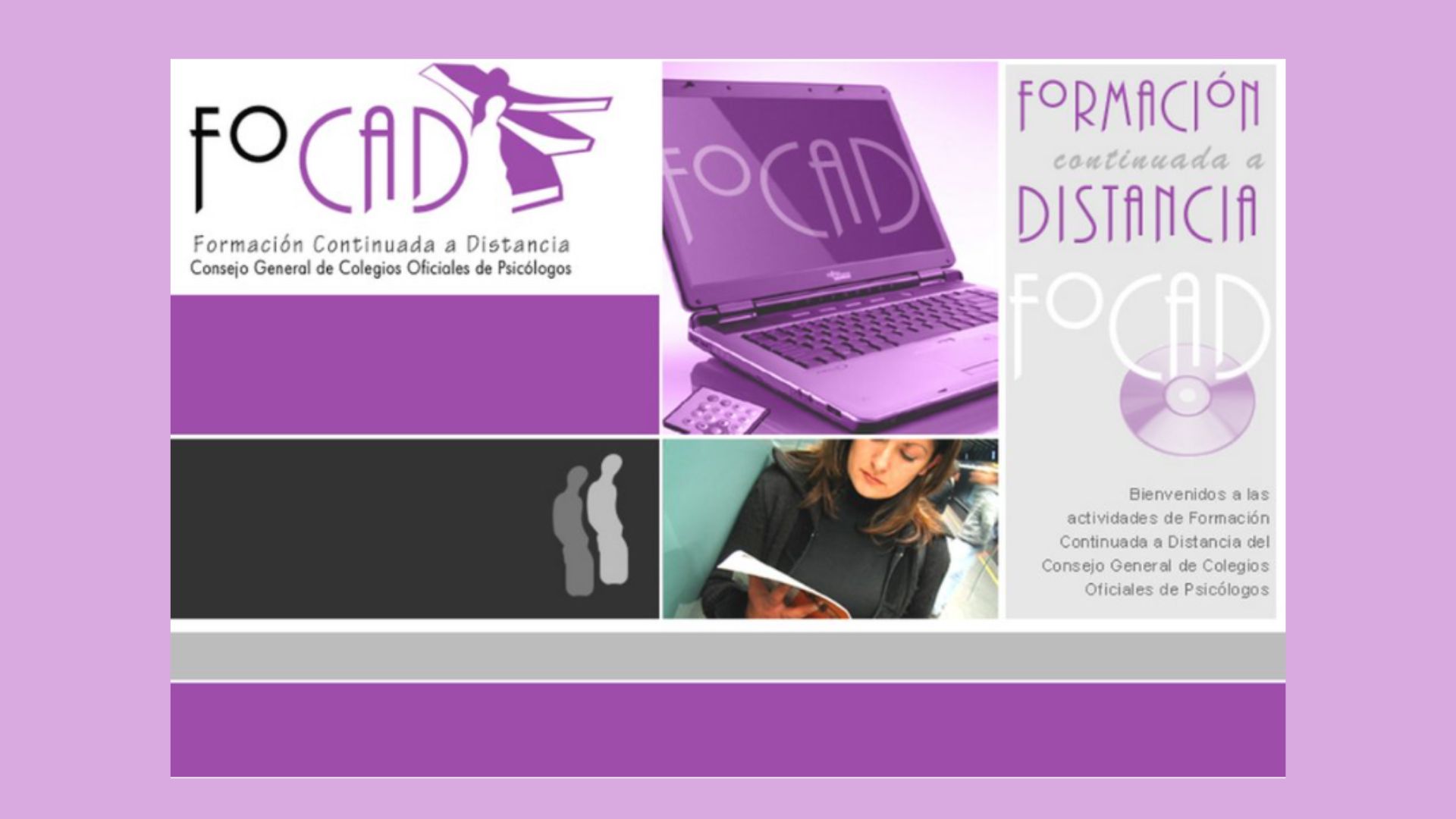 El Consejo General de la Psicología de España tiene en marcha un Programa de Formación Continuada a Distancia (FOCAD) con la finalidad de promover la actualización científico-profesional de los/as psicólogos/as colegiados/as en diferentes campos de la intervención psicológica (Psicología Clínica y de la Salud, Psicología Educativa, Psicología del Trabajo, las Organizaciones y los Recursos Humanos, Psicología de la Intervención Social, Psicología de la Actividad Física y el Deporte, Psicología Jurídica, Psicología del Tráfico y de la Seguridad, etc.)