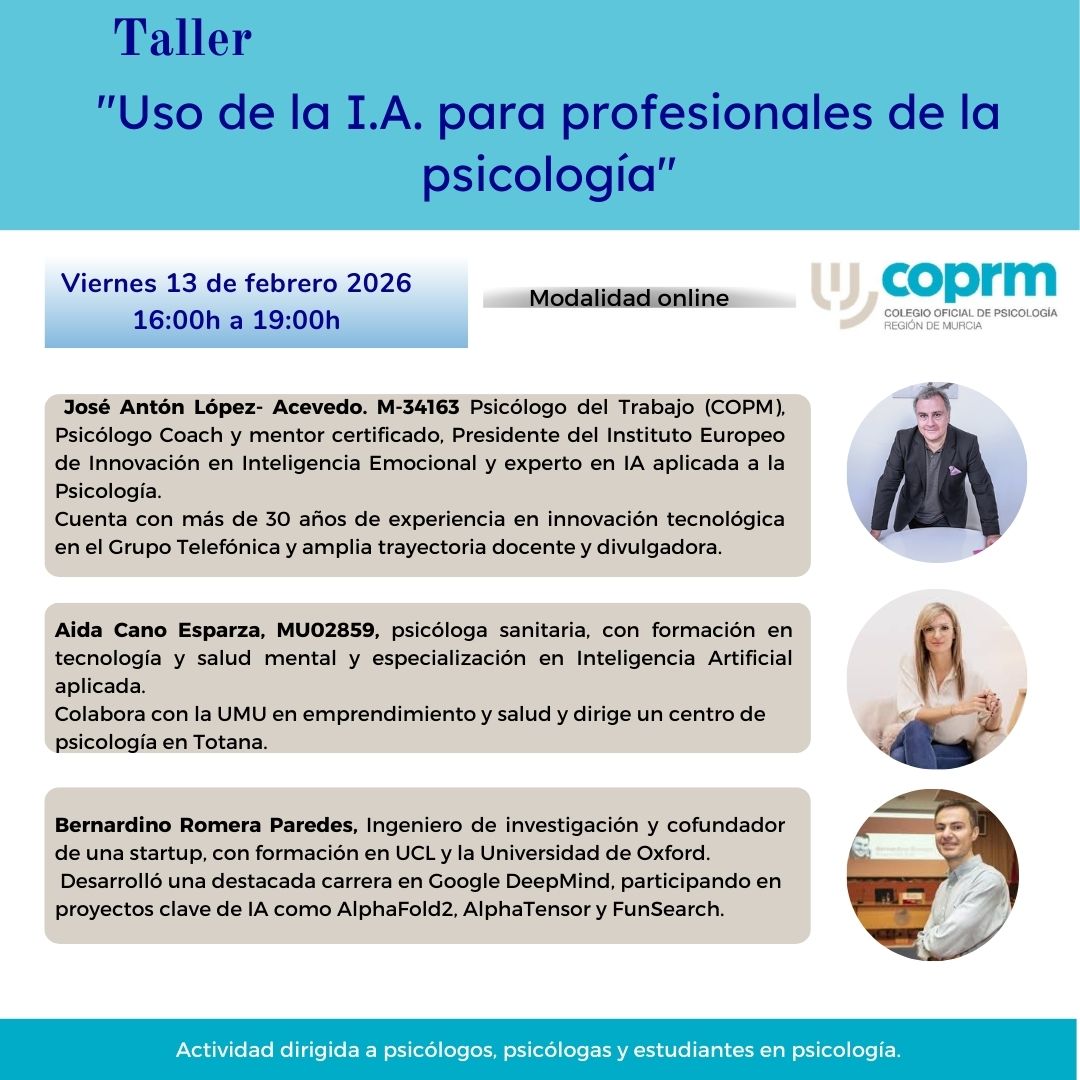 Ponentes:  José Antón López- Acevedo. M-34163 Psicólogo del Trabajo (COPM), Psicólogo Coach y mentor certificado, Presidente del Instituto Europeo de Innovación en Inteligencia Emocional y experto en IA aplicada a la Psicología. Cuenta con más de 30 años de experiencia en innovación tecnológica en el Grupo Telefónica y amplia trayectoria docente y divulgadora.