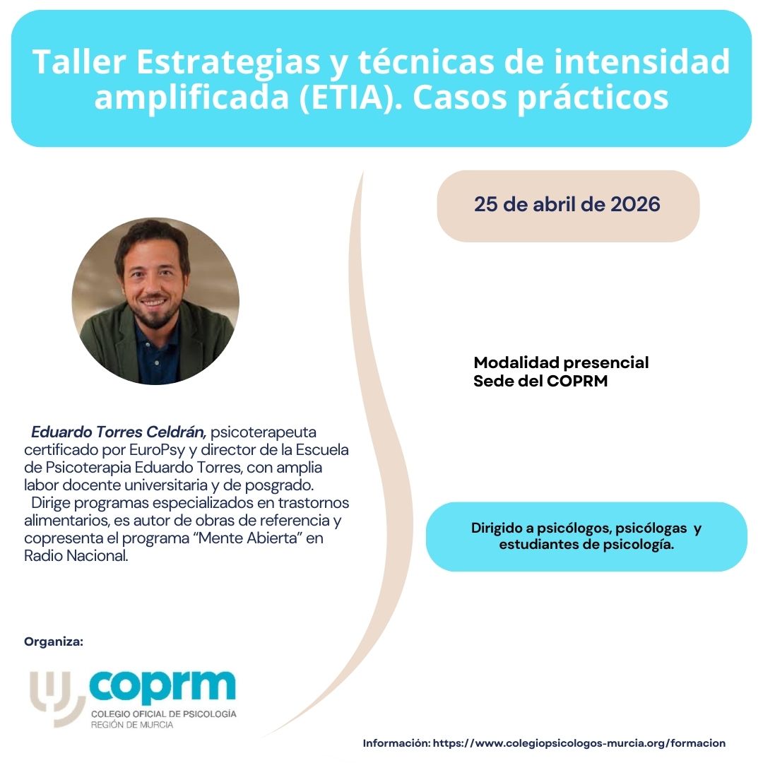 Ponente:   Eduardo Torres Celdrán, psicoterapeuta certificado por EuroPsy y director de la Escuela de Psicoterapia Eduardo Torres, con amplia labor docente universitaria y de posgrado. Dirige programas especializados en trastornos alimentarios, es autor de obras de referencia y copresenta el programa “Mente Abierta” en Radio Nacional.