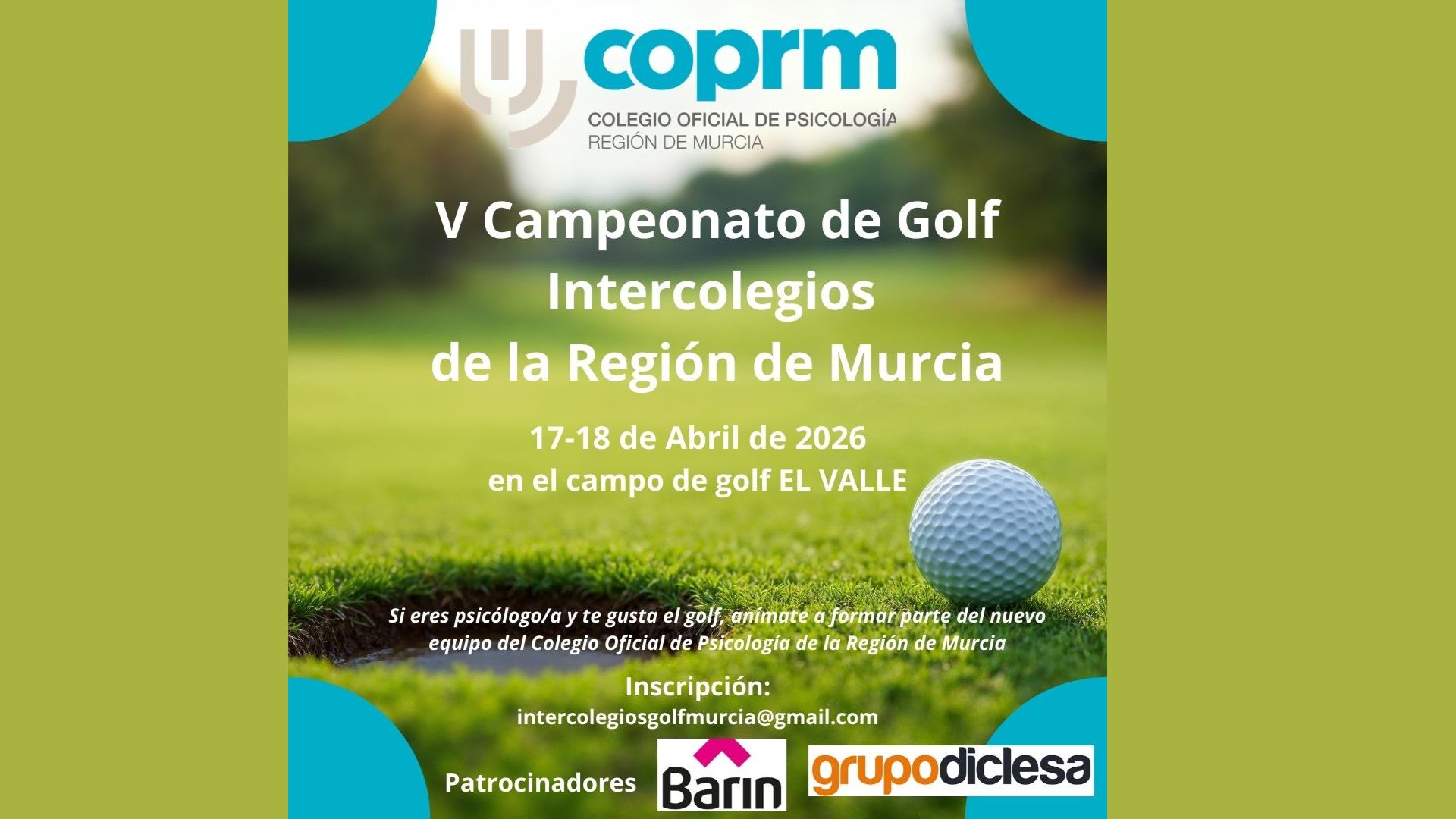 Se celebrará el próximo 17 y 18 de abril (viernes y sábado) de 2026 en el campo de golf EL VALLE. Si eres psicólogo/a y te gusta el golf, anímate a formar parte del nuevo equipo del Colegio Oficial de Psicología de la Región de Murcia.